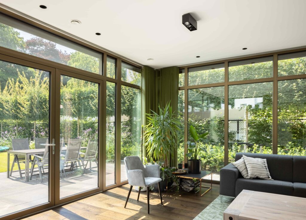 De vele verschillende kleuren ogen fris en tegelijkertijd kalm, en de bijna volledig glazen achterkant van de villa verschaft een oase aan daglicht. Daarbij zorgt het HR++ glas dat standaard in dergelijke profielen wordt geïnstalleerd dat deze glazen façade warmte buiten houdt en hiermee het woongenot niet compromitteert.